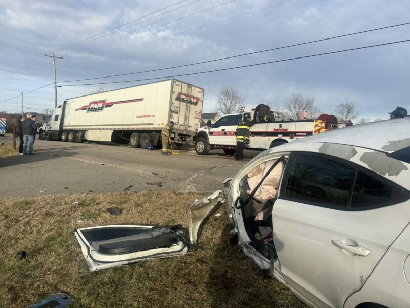 Units arriving on scene found a passenger vehicle and a semi involved in the crash, with one occupant trapped inside the car. Firefighters quickly removed a door to free the individual, who sustained apparent minor injuries.